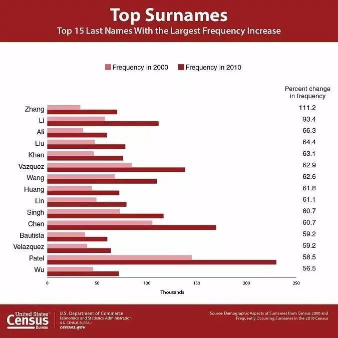 美國人口調查局發布了一份1990-2010年間美國人姓氏的變化趨勢,有趣的是最常見的姓前三名排序完全一樣,分別是史密斯(Smith)、約翰遜(Johnson)和威廉姆斯(Williams)。增長最快的15個姓氏中,中國的姓氏占了8席,其中Zhang和Li更是位列前兩名,其他中國姓氏還包括Liu、Wang、Huang、Lin、Chen和Wu。(美通社,2016年12月15日華盛頓)