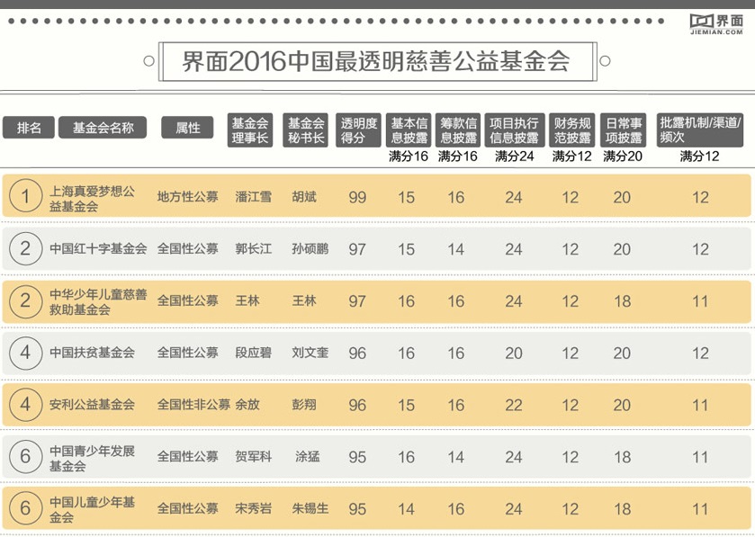 • 界面發布“2016年中國最透明慈善公益基金會排行榜”
