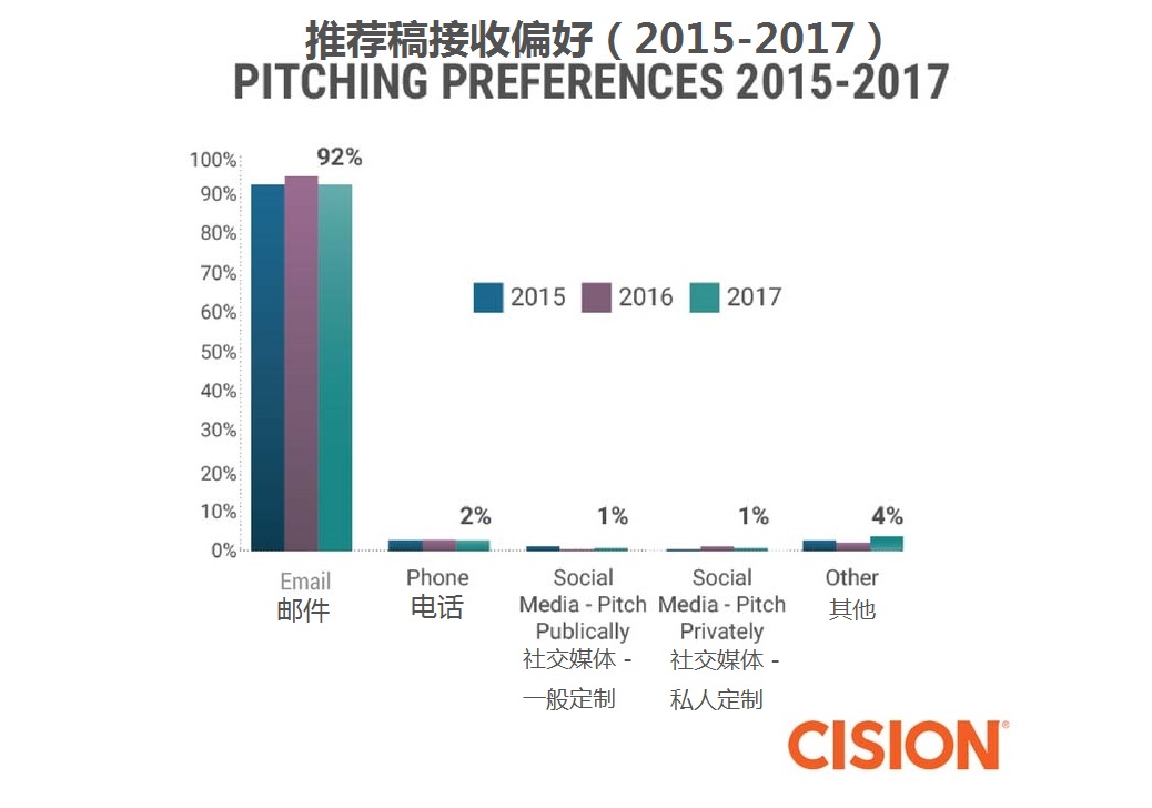 新聞記者現在更傾向于使用圖片、視頻、信息圖和用戶生成的多媒體內容,而不只是數據。盡管使用社交媒體的頻率在增加,但只有44%的新聞記者認為社交媒體是可靠的信息來源,這一比例較2016年下降7%。另外,92%的新聞記者更喜歡通過電子郵件的方式接收公關推薦稿,他們對公關專員提出的最重要建議是,研究以前的新聞報道,為新聞記者提供他們希望看到的定制推薦稿。(美通社,2017年3月28日芝加哥)