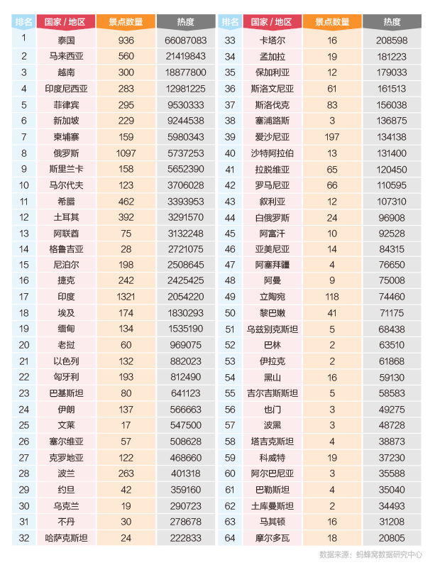 近日,螞蜂窩發(fā)布了《2017絲綢之路旅游大數(shù)據(jù)報(bào)告》,對“一帶一路”沿線64個(gè)境外國家和地區(qū)的旅游熱度、旅游資源分布進(jìn)行了分析。其中,東南亞成為“一帶一路”上的旅游大熱門,在旅游熱度排行榜中,占領(lǐng)了前7所有席位,前20中亦占領(lǐng)11位。泰國無論在旅游熱度還是旅游資源方面,都處于領(lǐng)先地位。位于歐洲邊緣的格魯吉亞,盡管熱門旅游景點(diǎn)僅有28個(gè),旅游熱度仍排在了第14位,遠(yuǎn)遠(yuǎn)超過其他擁有同等旅游資源的國家。埃及成為唯一排在前20位的非洲國家。(美通社,2017年5月10日北京)