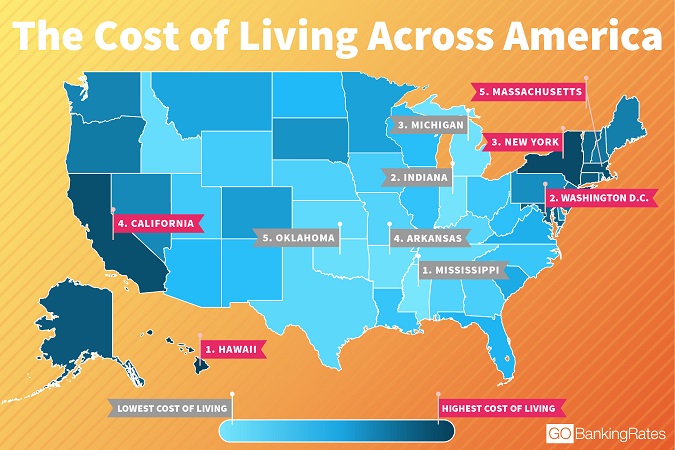 美國財經(jīng)網(wǎng)站GOBankingRates的一項調查顯示,美國生活成本最高的五個州分別是夏威夷州、哥倫比亞特區(qū)、紐約州、加州以及馬薩諸塞州,而生活成本最低的五個州則分別是密西西比州、印第安納州、密歇根州、阿肯薩斯州以及俄克拉荷馬州。這項排名是綜合比較各州房價、日用品、水電氣、交通、健康醫(yī)療以及各種雜項開支后得出的。值得一提的是,房價方面,華盛頓特區(qū)要比全美平均房價高出134%,成為美國房價最貴的地區(qū),加州緊隨其后,高出全國平均水平92.7%。(美通社,2017年5月11日洛杉磯)