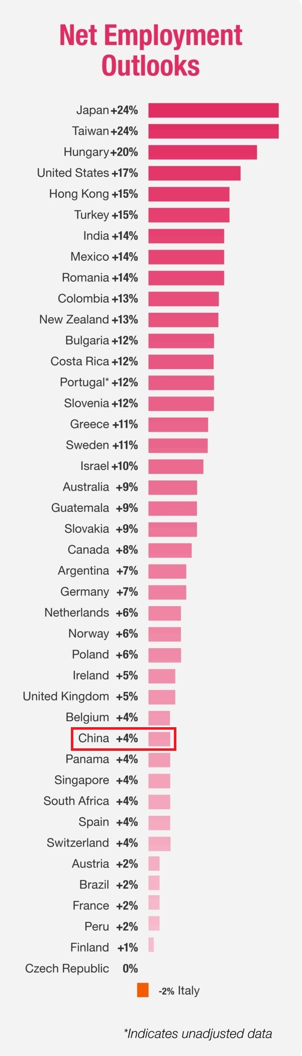 萬寶華盛ManpowerGroup最新的雇傭前景調查顯示,2017年第三季度,受調查的43個地區中,有41個地區的雇主計劃擴大招聘。其中,招聘意愿最強烈的地區是日本、臺灣、匈牙利和美國,而意大利、捷克、芬蘭等地的雇主招聘意愿最低。亞太地區,中國和新加坡兩地的雇主招聘意愿最低。(美通社,2017年6月11日洛杉磯)
