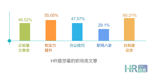 調研顯示,60.21%的受訪者喜歡“自我建設類”的職場文章,另有55.05%的受訪者對“軟實力提升類”文章感興趣。相比之下,大家還是更在意自我管理與能力的提升。