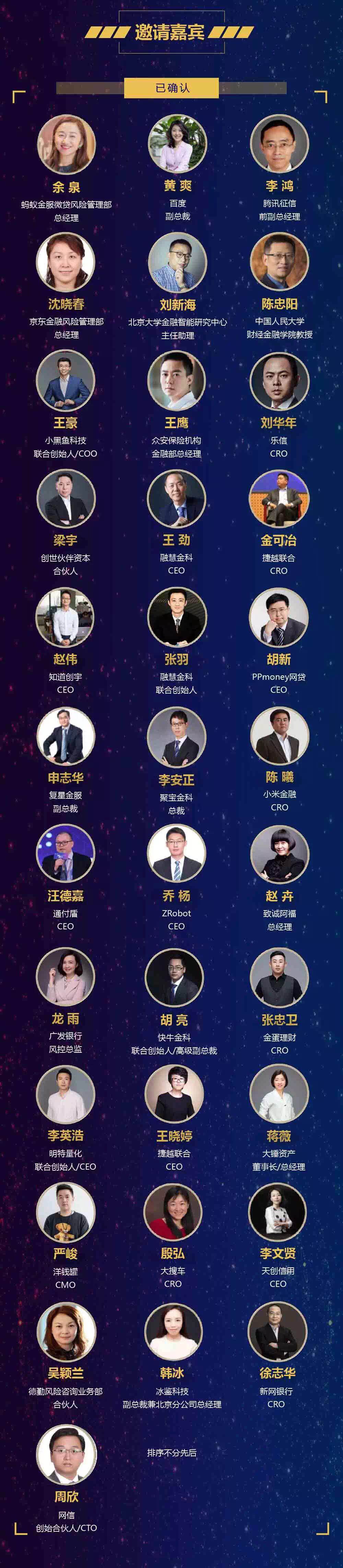 屆時,幾十位金融界大咖將出席活動。如融慧金科CEO王勁;知道創宇CEO趙偉;融慧金科聯合創始人張羽;小米金融CRO、信貸業務負責人陳曦;捷越聯合創始人、快催收創始人王曉婷;明特量化聯合創始人、CEO李英浩;ZRobot CEO喬楊;致誠阿??偨浝碲w卉;PPmoney網貸CEO胡新;創世伙伴資本合伙人梁宇;通付盾CEO汪德嘉;聚寶金科總裁李安正;大錘資產董事長、總經理蔣薇;冰鑒科技副總裁韓冰;捷越聯合CRO金可冶;快牛金科聯合創始人、高級副總裁胡亮;廣發銀行風控總監龍雨;金蛋理財CRO張忠衛;小黑魚科技聯合創始人、COO王豪;眾安保險機構金融部總經理王鷹;樂信CRO劉華年;復星金服副總裁申志華;大搜車CRO殷弘;洋錢罐CMO嚴峻;天創信用CEO李文賢;新網銀行CRO徐志華;世界銀行集團IFC特聘專家丁宇;德勤風險咨詢業務部合伙人吳穎蘭;網信創始合伙人、CTO周欣、麥子金服副總裁兼首席風控官李曉忠等。