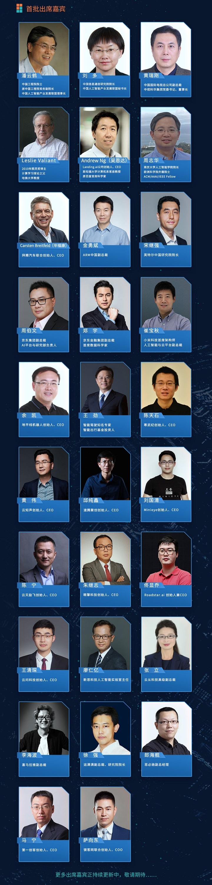 這其中,包括了國家新一代人工智能戰略咨詢委員會組長、中國人工智能產業發展聯盟理事長、中國工程院院士、原中國工程院常務副院長潘云鶴;中國信息通信研究院院長、中國人工智能產業發展聯盟秘書長劉多;中國國際電視總公司副總裁、中視科華集團董事長黃瑞剛;2010年圖靈獎獲得者,計算學習理論之父Leslie Valiant(萊斯利·瓦利安特);人工智能領域“四大天王”之一,Landing.ai創始人、CEO,斯坦福大學計算機系客座教授,前百度首席科學家Andrew Ng(吳恩達);國內首家C9高校人工智能學院-南京大學人工智能學院院長,ACM/AAAI/IEEE Fellow周志華;拜騰汽車聯合創始人、CEO Carsten Breitfeld(畢福康);ARM中國副總裁金勇斌;英特爾中國研究院院長宋繼強;京東集團副總裁、AI平臺與研究部負責人周伯文;京東金融集團副總裁、首席數據科學家鄭宇;小米科技首席架構師、人工智能與云平臺副總裁崔寶秋;地平線機器人創始人、CEO余凱;智能駕駛知名專家、智能出行基金投資人王勁;寒武紀創始人、CEO陳天石;云知聲創始人、CEO黃偉;速騰聚創創始人、CEO邱純鑫;Minieye創始人、CEO劉國清;云天勵飛創始人、CEO陳寧;眼擎科技創始人、CEO朱繼志等眾多AI大咖齊聚南京,共話行業創新發展。還有一批重量級的大咖嘉賓正在陸續回函確認出席峰會,并將帶來最精彩的觀點分享。
