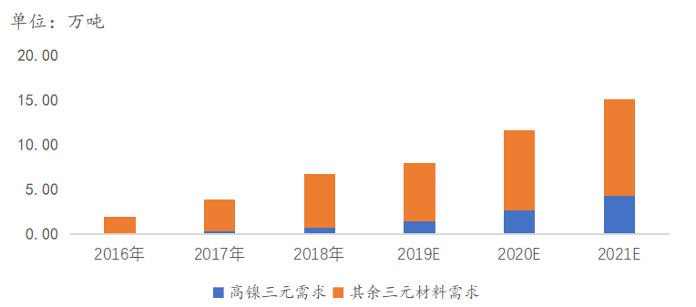 圖:2016-2021年中國動力電池對高鎳三元的需求量