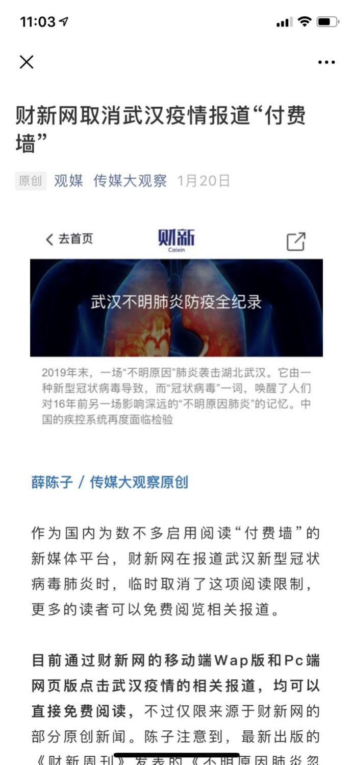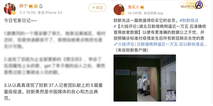 在新冠肺炎疫情的報道過程中,以財新為代表的部分媒體體現(xiàn)出專業(yè)新聞媒體的責任與擔當。重大事件的報道,財新團隊從不缺席。網(wǎng)友這樣評論他們: