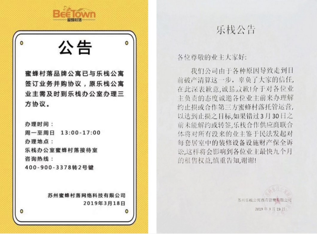 3月18日,蜜蜂村落品牌公寓發(fā)布公告,正式并購樂棧公寓;3月19日,樂棧公寓也發(fā)出公告,告知公司已經(jīng)破產(chǎn)清算,原來相關(guān)業(yè)務(wù)由蜜蜂村落托管運(yùn)營。