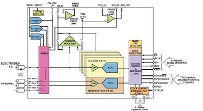 ADAS1000 的其它主要特性和優(yōu)勢包括:直流耦合通道方案具有簡化輸入切換、增加功能、降低功耗和獨特的后處理優(yōu)勢;5個 ECG 電極測量的工作功耗僅19mW,可以方便地禁用任何不用的通道或特性,使一個導聯(lián)的較低功耗僅11mW;低噪聲性能(0.05 Hz至150 Hz范圍內(nèi)10 µV峰峰值)支持終端設(shè)備監(jiān)管標準;提供不同的數(shù)據(jù)幀速率(2kHz、16kHz、128kHz),較大程度地簡化數(shù)據(jù)采集任務(wù);能夠簡化整體設(shè)計,去除許多分立器件,并縮減系統(tǒng)整體尺寸、降低功耗、縮短開發(fā)時間。該器件還集成了起搏器脈搏檢測和呼吸測量功能,這些特性對于高性能 ECG 系統(tǒng)至關(guān)重要。