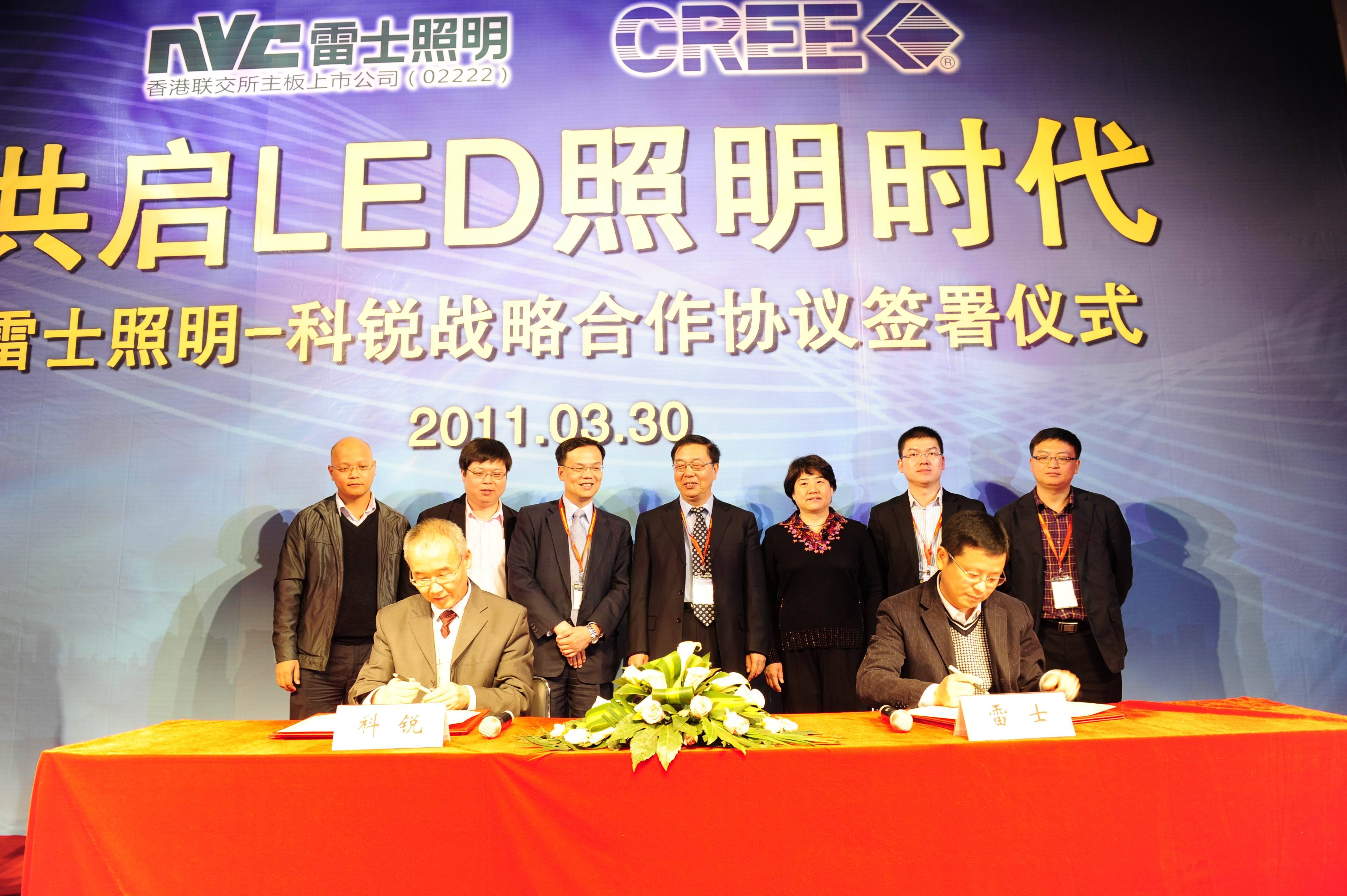 中國惠州2011年3月31日電 /美通社亞洲/ -- 國際知名專業照明企業雷士照明(香港主板上市代號:2222)與全球LED 照明領域的行業領先者科銳公司(Nasdaq: CREE) 在上海簽署戰略合作協議,進行強強聯合,全面推動半導體照明產業的發展與變革。