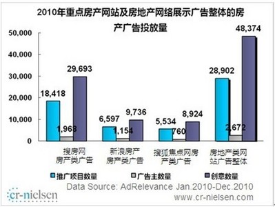 2011年第一季度搜房網房產類廣告投放量行業占比近六成,領跑行業。2011年 Q1搜房網房產類廣告的推廣項目數占行業整體56.5%;2011年 Q1 搜房網房產類廣告主數占房產廣告整體廣告主數的70.9%;2011年 Q1搜房網房產類廣告創意數行業占比55.2%,各項指標均處于領先地位。