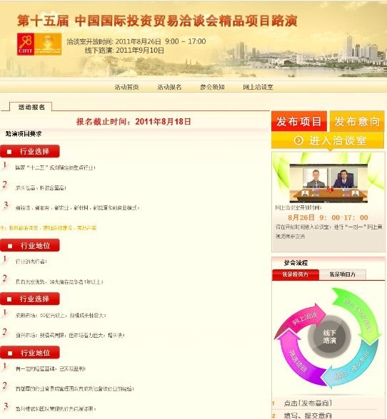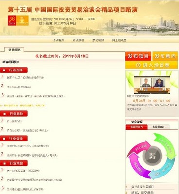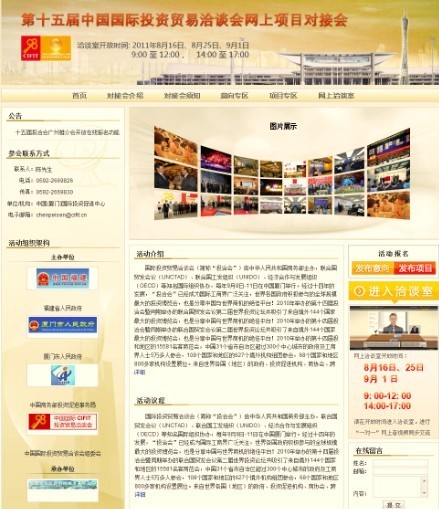 本屆“網(wǎng)上項目對接會”活動(www.cifit.cn/duijie)將于8月16日、8月25日、9月1日分三場在網(wǎng)上投洽會平臺(www.cifit.cn)上舉行。網(wǎng)上項目對接會將匯集全國各地精品項目和優(yōu)質(zhì)投資機構(gòu),投融資雙方可通過網(wǎng)上項目對接會發(fā)布投資意向、尋找招商項目或投資機構(gòu),并在網(wǎng)上投洽會的網(wǎng)上洽談室,實現(xiàn)“一對一、面對面”在線洽談;如達成初步合作意向,對接雙方可于2011年9月8日-11日在廈門會展中心做深入溝通。