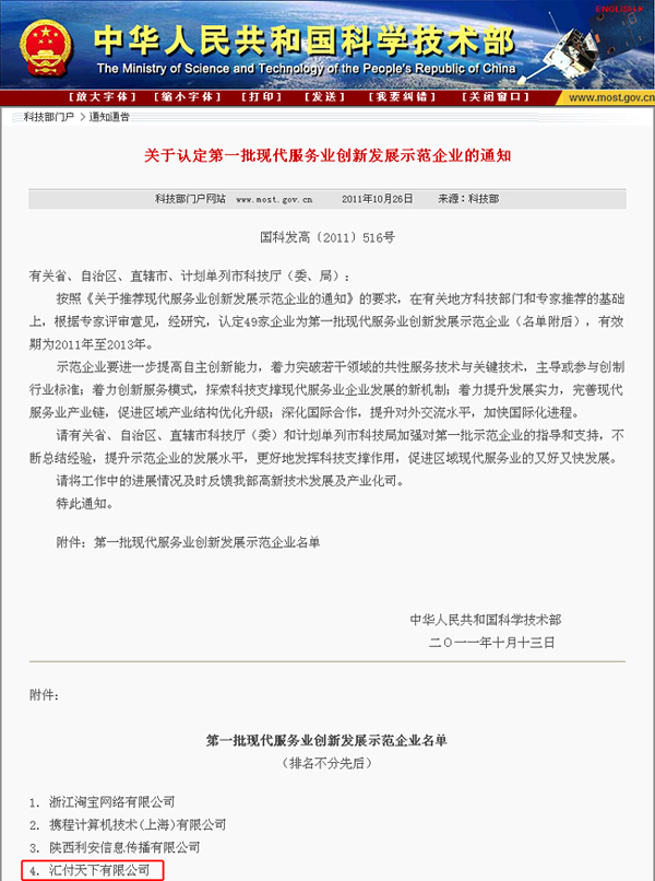 上海2011年10月27日電 /美通社亞洲/ -- 2011年10月26日,科技部網站最新刊登《關于認定第一批現代服務業創新發展示范企業的通知》,匯付天下有限公司(以下簡稱“匯付天下”)作為第三方支付企業的唯一代表,名列其中。