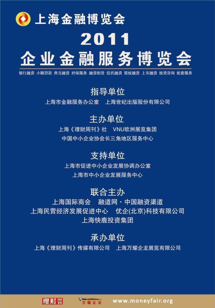 2011企業金融服務博覽會是在上海市促進中小企業發展協調辦公室、上海市中小企業發展服務中心的指導下,上?!独碡斨芸飞?、VNU 歐洲展覽集團、中國中小企業協會長三角地區服務中心共同主辦。
