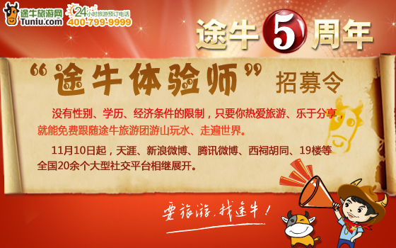 北京和上海2011年11月21日電 /美通社亞洲/ -- 途牛旅游網推出5周年系列活動–“途牛體驗師”PK 賽,看到招募令中“游遍全世界的夢”如此美好的字眼,環游世界的夢想是否也曾在腦海中浮現?是否也向往碧海白沙的悠閑與愜意,向往祖國山川的壯闊與秀麗?“途牛體驗師”,讓夢想輕松實現!