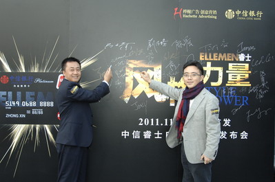 上海和深圳2011年11月29日電 /美通社亞洲/ -- 由高端男性雜志《ELLE MEN 睿士》攜手中信銀行共同舉辦的“風格力量 Style Power”中信睿士白金信用卡在上海和深圳兩地同步首發。樺榭中國董事總經理艾彌爾先生以及中信銀行信用卡中心總裁助理呂天貴先生出席,共同宣布中國最有“范兒”白金信用卡的誕生。