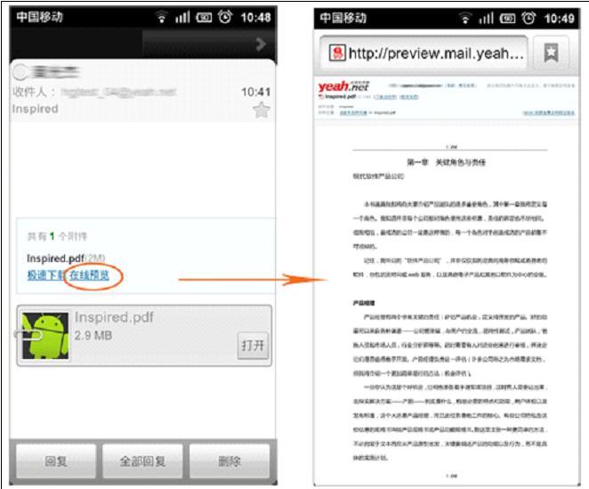 據(jù)網(wǎng)易郵箱產品經理介紹,對于網(wǎng)易郵箱(163.com、126.com、yeah.net)的4.3億用戶,只要通過 IMAP 方式收取網(wǎng)易郵箱附件,不管是否安裝任何打開附件的軟件,都可以在手機和 ipad 等終端(包括 PC 客戶端、Android 手機端、iPhone 端、iPad 端的用戶)上在線預覽附件,不占用各手機和 iPad 的空間,這在國內郵箱運營商中屬于首創(chuàng)。