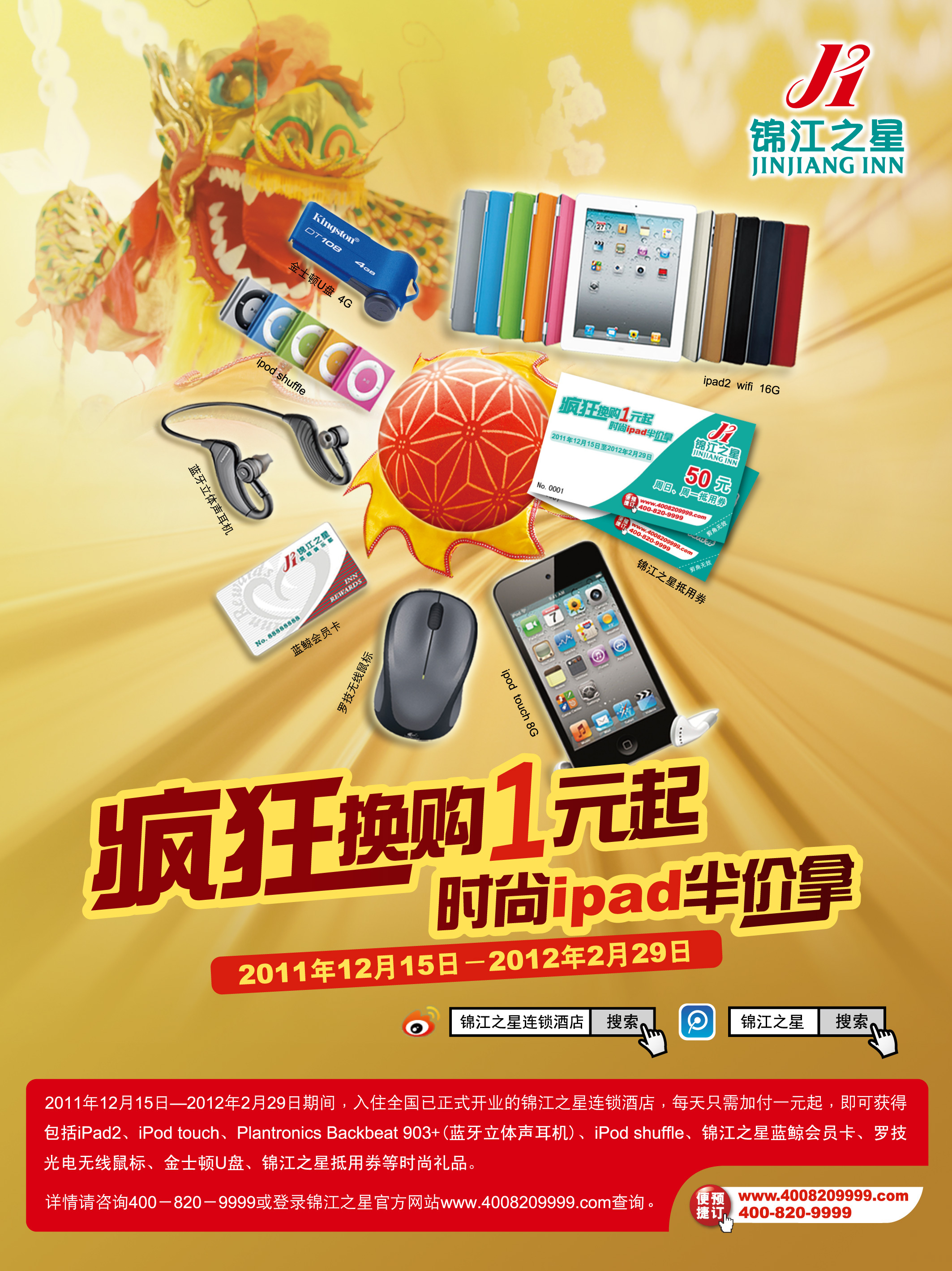 除了“瘋狂換購一元起,時尚iPad半價拿”的換購活動外,凡是在2012年3月31日前撥打錦江之星400-820-9999預訂錦江之星連鎖酒店的客人,還可在門市價基礎上享受每間夜立減9元的優惠。