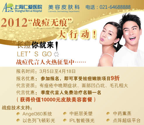 上海2012年3月14日電 /美通社亞洲/ -- 近日,上海仁愛(ài)醫(yī)院推出2012“戰(zhàn)痘無(wú)痕”大行動(dòng),現(xiàn)正火熱征集代言人,成功當(dāng)選者即可享受全程免費(fèi)祛痘和修復(fù)治療。想要成為美麗戰(zhàn)痘士?快來(lái)參加吧!