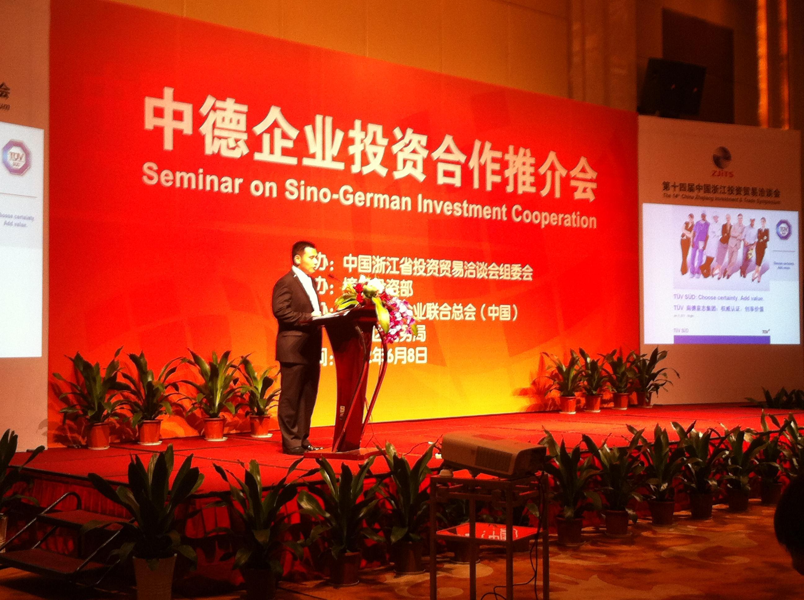寧波2012年6月8日電 /美通社亞洲/ -- 2012年6月8日,TUV南德意志集團(tuán)受邀參加中德企業(yè)投資說明會。參與此次活動的有來自浙江地區(qū)的家電電子、紡織、戶外休閑品等消費領(lǐng)域的知名廠商。該活動旨在探討浙江區(qū)域消費品行業(yè)趨勢及國際化發(fā)展之路,并加強中德之間的技術(shù)交流,為企業(yè)與國際市場的交流與對接提供一個良好平臺。TUV南德意志大中華集團(tuán)浙江區(qū)域總經(jīng)理陳辰先生受邀發(fā)表了題為“浙江相關(guān)產(chǎn)業(yè)的出口要求及未來趨勢及發(fā)展”的演講。