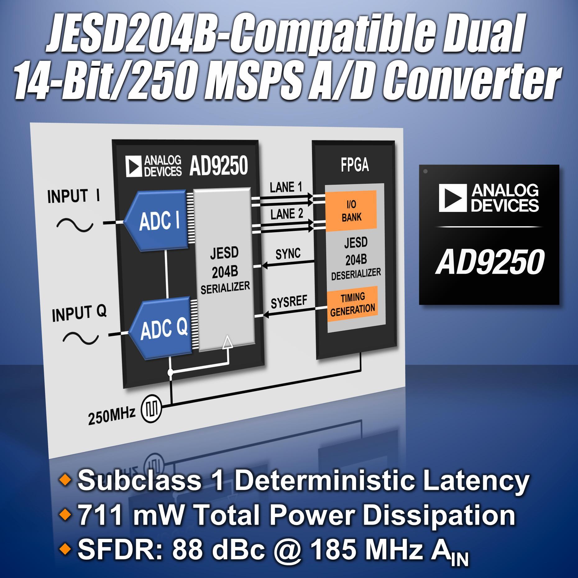 新型雙通道14位250 MSPS ADC AD9250通過(guò)JESD204B兼容輸出與高速FPGA無(wú)縫連接,并支持精密多通道轉(zhuǎn)換器同步。