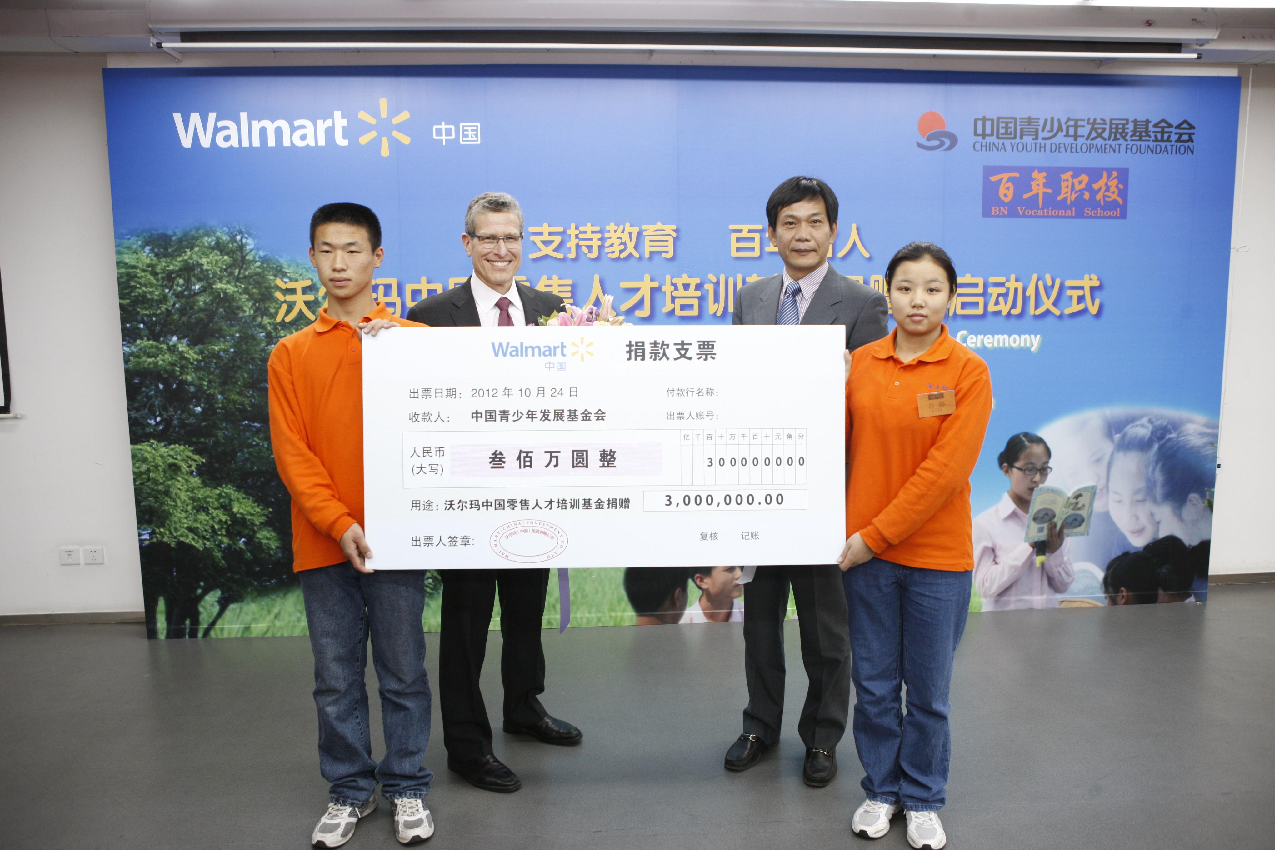 北京2012年10月24日電 /美通社/ -- 今天,沃爾瑪中國與中國青少年發展基金會在北京百年職校舉行“沃爾瑪零售人才培訓基金”捐贈儀式,并正式啟動該基金。沃爾瑪將向中國青少年發展基金會捐贈300萬元,用于建立“沃爾瑪中國零售人才培訓基金”。該公益培訓基金將用于為百年職校在全國各地的校區培養零售行業專業人才,推廣經過沃爾瑪和國際青年基金會(International Youth Foundation, or IYF)聯合開發的零售人才培訓教材的中文版,并向百年職校零售培訓的優秀學生授予沃爾瑪零售人才獎學金。