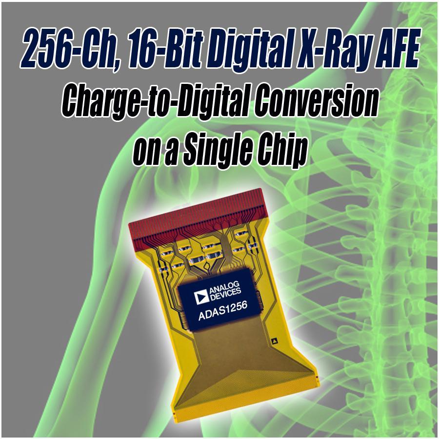 ADI公司的ADAS1256模擬前端(AFE)在單芯片中集成完整的電荷至數字轉換信號鏈,支持包括便攜式系統在內的多種數字X射線成像方式。