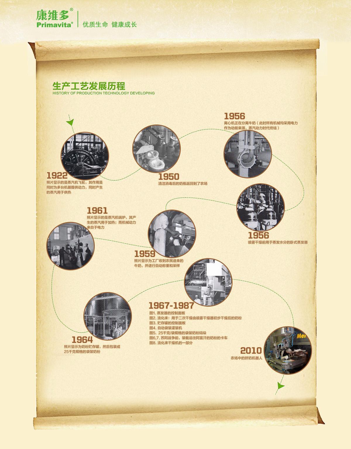 二十世紀六十年代,第二代配方奶粉研制成功,以母乳營養為黃金標準,混合了各種營養成分,最終得到在營養素種類、功能上均接近母乳水平的配方奶粉。從此無數因缺乏母乳喂養導致營養不良的嬰幼兒可以健康成長。同一時期工業大革命帶來歐洲經濟的大發展,惠及乳制品生產業。荷蘭以其得天獨厚的的畜牧業資源優勢,為其發達的乳制品生產制造業創造了條件。二十世紀六十年代的康維多(PRIMAVITA)Heino工廠已成為當地聞名的乳制品生產商,擁有大型廠房、先進的噴霧干燥器和蒸發器、專業營養科研團隊。