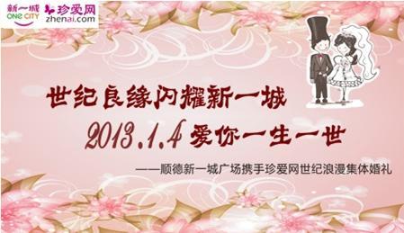 廣州2012年12月31日電 /美通社/ -- 在百年難得一遇的幸福起點,擁有真愛恒久流傳的浪漫回憶,是單身男女都期盼著的幸福人生。2013年1月4日,順德新一城攜手中國較大的相親網(wǎng)站珍愛網(wǎng) (zhenai.com) 在佛山順德新一城廣場舉辦的“世紀良緣閃耀新一城,2013.1.4愛你一生一世”世紀浪漫集體婚禮即將濃情啟幕,為新人締造一場甜蜜浪漫的世紀回憶。