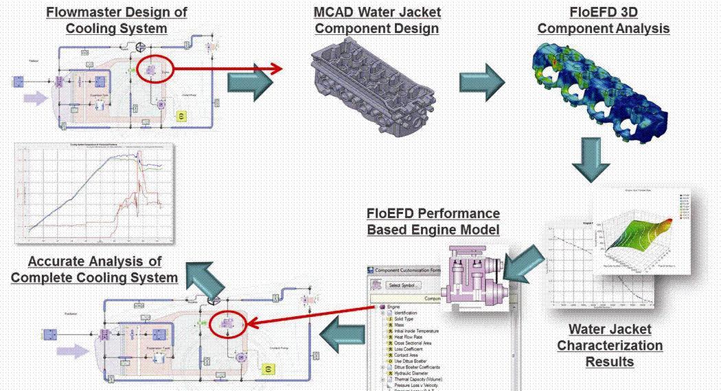 該模型被簡單地嵌入 Flowmaster 工具相關數據庫。如今系統設計師能通過新汽車模型預期的系列駕駛情境來進行冷卻分析。冷卻系統中可加入設計變化,從而運行執行分析。水套模型保持完好無缺,因為它涵蓋了所有可能的操作環境。