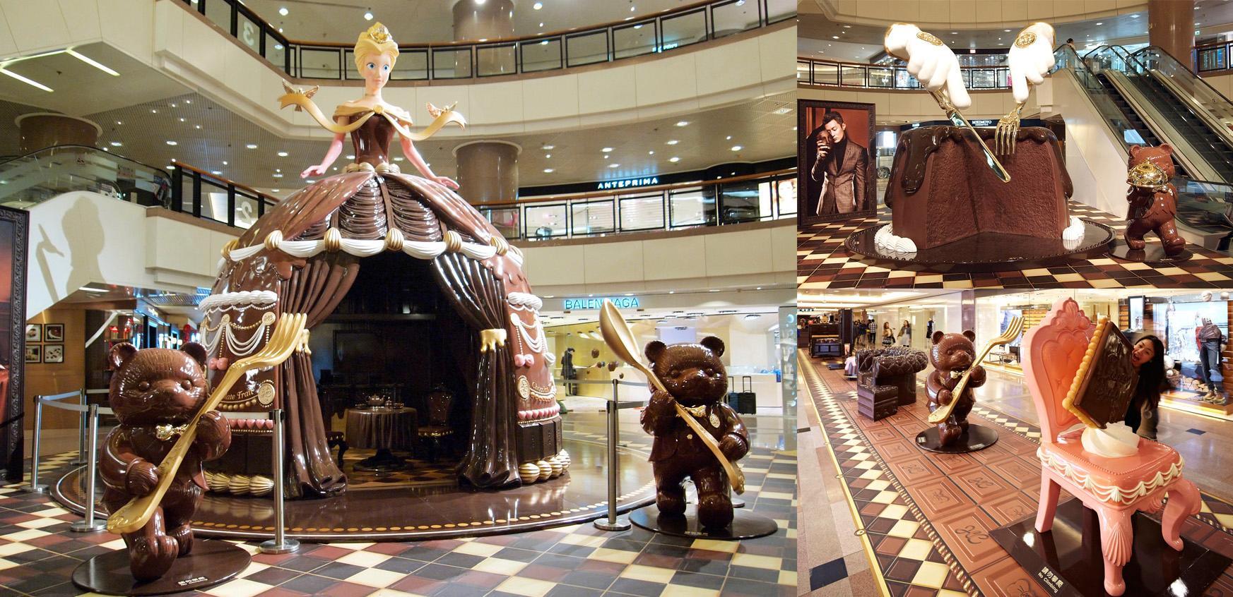 海港城將整個港威商場大堂打造成“朱古力大宅”,讓每個人都可成為童話中的主角!推開朱古力磚大門走進100%可口的朱古力大宅,內(nèi)有小熊管家恭候貴賓光臨。商場大堂I及II分別有優(yōu)雅精致的公主造像及其長裙下的英式大宅,加上心思十足的巨型朱古力蛋糕,將大家引領(lǐng)入夢寐以求的朱古力浪漫盛宴。