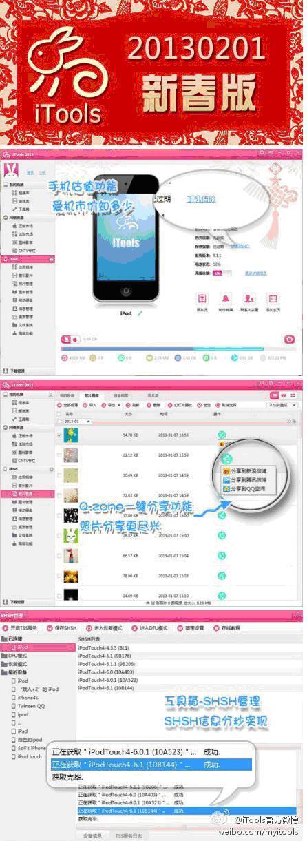 深圳2013年2月4日電 /美通社/ -- 春節(jié)快來了,四處洋溢著濃厚的過節(jié)氣氛,iOS6.1也趕上春節(jié)的浪潮乘勢(shì)發(fā)布,惹得我們內(nèi)心都蠢蠢欲動(dòng)了。 iTools 推出 20130131 新春正式版,全面支持最新 iOS6.1 管理和 iOS6.1 的 SHSH 備份,特色新春版界面,節(jié)日氣氛更濃郁;程序庫加倍優(yōu)化,管理更高效,更有手機(jī)估值、Q-Zone分享和農(nóng)歷一鍵添加等特色功能,讓你的蘋果變簡(jiǎn)單。