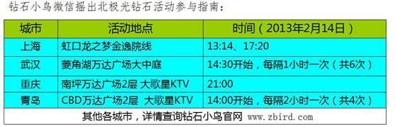 他透露,2月14日當天只要在所在城市指定的地點參與鉆石小鳥微信搖一搖活動便可獲贈鉆石小鳥北極光鉆石及其他精美禮品,為此,鉆石小鳥特別設置開通了“鉆石小鳥北極光”這一官方微信號,只要在活動現場通過微信搖動手機,添加加這一官方微信號并成功打招呼,便有了獲得禮品的資格。
