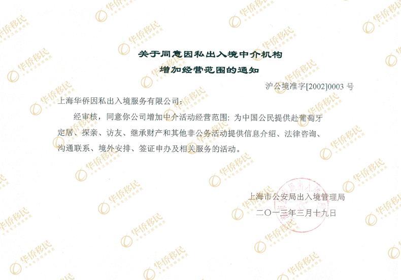 經過幾個月漫長的考核,上海市公安局出入境管理局認可了華僑移民增加辦理葡萄牙移民經營范圍。華僑移民可以為中國公民提供赴葡萄牙定居、探親、訪友、繼承財產和非公務活動提供介紹、法律咨詢、溝通聯系、境外安排、簽證申辦及相關服務的活動。華僑移民終于獲批上海市公安局出入境管理局的正式批文,并已經送達華僑移民上海總部。