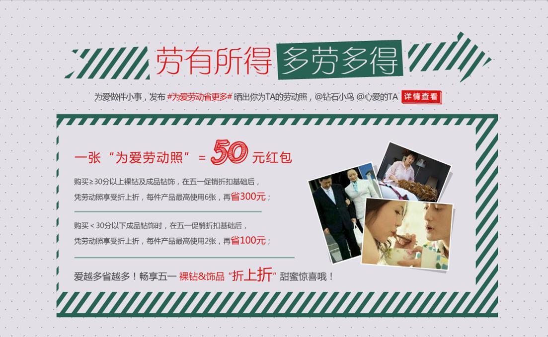 “愛情任務”也是非常有趣的環節。愛人之間哪怕一些小的舉動都會令對方感動不已,而作為一個稱職的愛人是否在這個勞動節對對方有所表示呢?你為對方斟了一杯香濃的咖啡抑或做了一桌可口的飯菜,或者喂對方吃了一口心儀的甜品。在微博上曬一張勞動照片并@鉆石小鳥,就可得50元現金抵用券,愛心付出越多,收獲也將會更多。在活動期間至鉆石小鳥各地體驗中的消費者也能現場完成任務表達愛意。