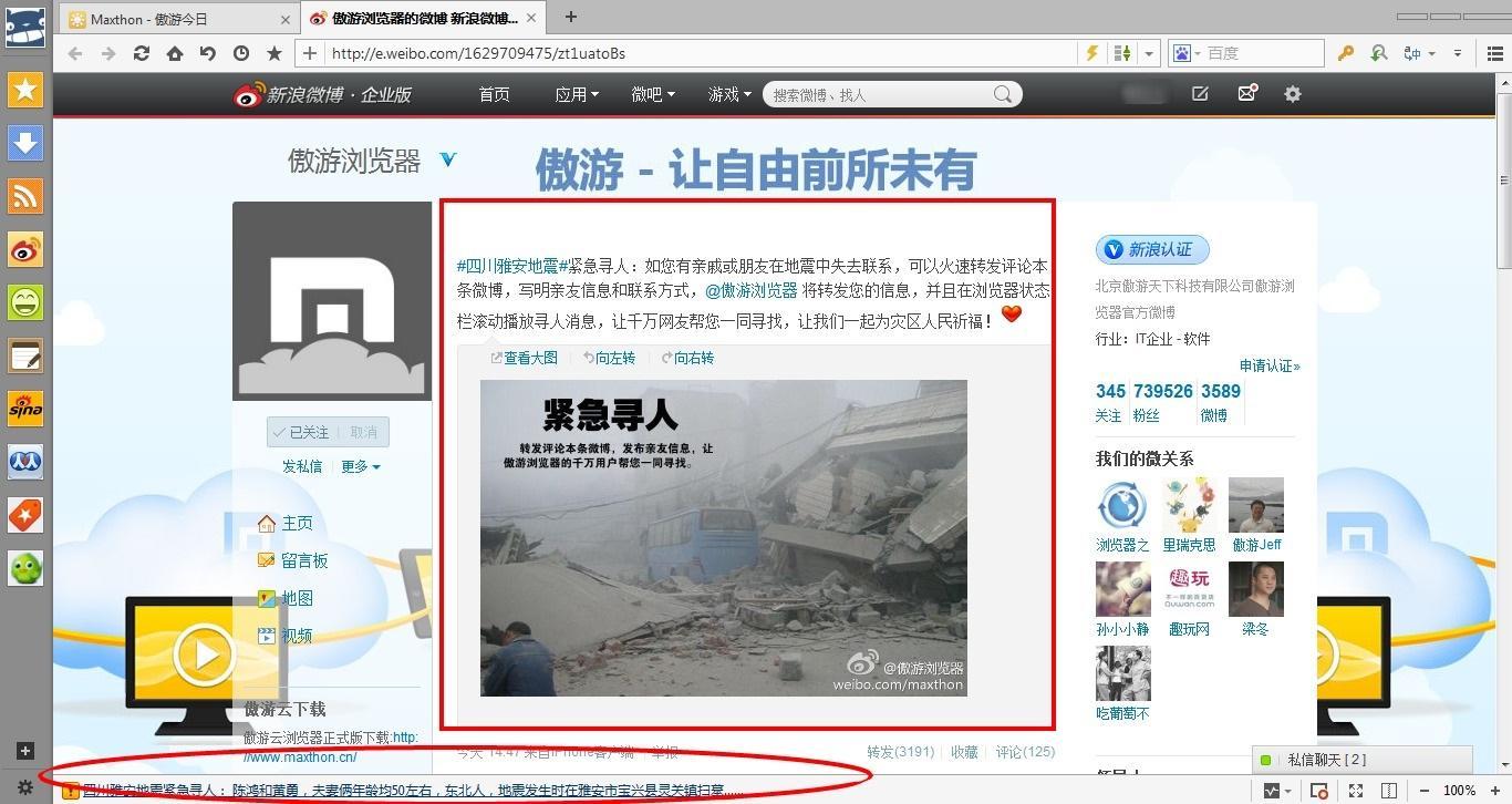 同時,傲游還及時推出“雅安地震尋人”的微博公益活動,災區群眾可以關注傲游云瀏覽器新浪官方微博,通過回復,進行人工求助和尋找親人等。關心災區傲游用戶,還可以通過關注傲游云瀏覽器的官方微博了解更多災區情況。