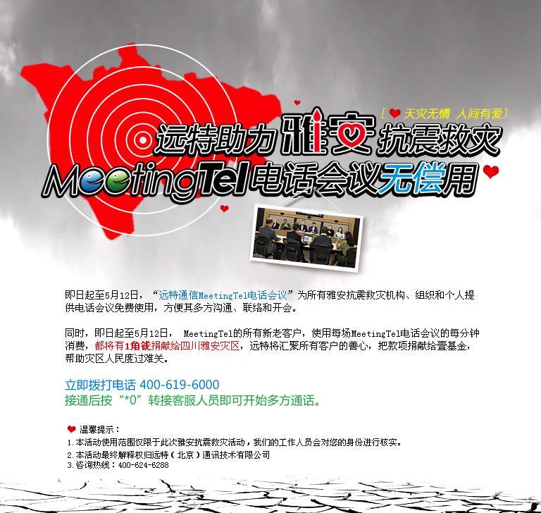 即日起至5月12日,遠(yuǎn)特通信電話會(huì)議MeetingTel的所有新老客戶,使用每場(chǎng)MeetingTel電話會(huì)議的每分鐘消費(fèi),都將有1角錢捐獻(xiàn)給四川雅安災(zāi)區(qū)。