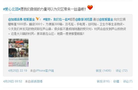 目前,傲游向四川災(zāi)區(qū)捐贈救災(zāi)物資的工作正在緊張開展。委托@加措活佛-慈愛基金 向災(zāi)區(qū)捐贈了帳篷1000頂,睡袋300個,方便面300箱,創(chuàng)可貼300包,以及若干毯子、雨衣、女性用品、手電筒、幼兒用品等災(zāi)區(qū)急需物資。并且在物資采購到位后,傲游還派出一名專業(yè)的傲游志愿者深入災(zāi)區(qū),協(xié)助基金會進行救助活動,一同保障物資能以較快速度送達災(zāi)區(qū)。在災(zāi)難面前,傲游用切實的行動展現(xiàn)了互聯(lián)網(wǎng)企業(yè)在危難時刻的擔(dān)當(dāng)。