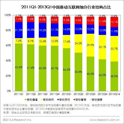 2013Q1 由于是網購的淡季,移動購物在整體市場中的占比增幅較小,然而移動購物的市場依然保持了較高增長;移動增值雖然仍是移動互聯網占比較高的細分行業,但其占比持續下降,傳統的增值業務不斷被其他領域擠壓,新興增值業務體量尚小;移動游戲增速較為平穩,在其他領域增速較高的背景下市場份額也處于下降趨勢;而新興的移動搜索及移動營銷基數較小,增速較高,占比也處于快速增長狀態。艾瑞預計未來移動購物將成為移動互聯網較大細分行業。