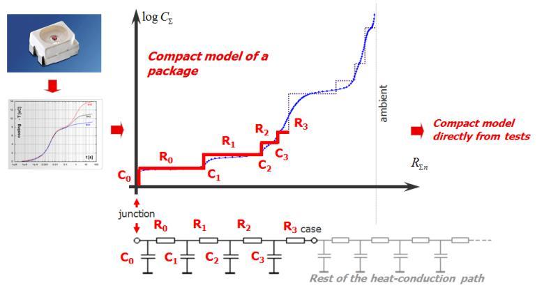 最基本的方法是測量部件與溫度相關的電壓。LED 從一個穩定的狀態打開或關閉,過一段時間之后,又到達另一個穩定的狀態(熱/冷,反之亦然)。在這個過程中不斷進行瞬態測量,提供很小測量電流下的熱瞬態響應曲線。在測量出的溫度差異和功率差異(用于開關部件)(圖2)的幫助下,便可得出結構函數(圖3)。