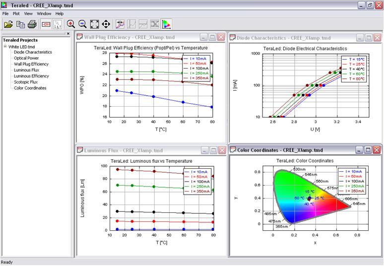 通過明導的 TERALED/T3Ster 測試硬件,也可以從測量中導出參數,如總光通量、總輻射通量、X、Y 和 Z 三色值,同時還可以完成一份頻譜分析。通過一種單一的綜合測量方法,可能會測出二極管特性、光功率、輻射效率、光通量、發光效率、暗視覺通量和色坐標對電流和溫度的依賴性,并將其顯示為 LED 的驅動電流、接面溫度或冷板溫度的一個函數(見圖5)。