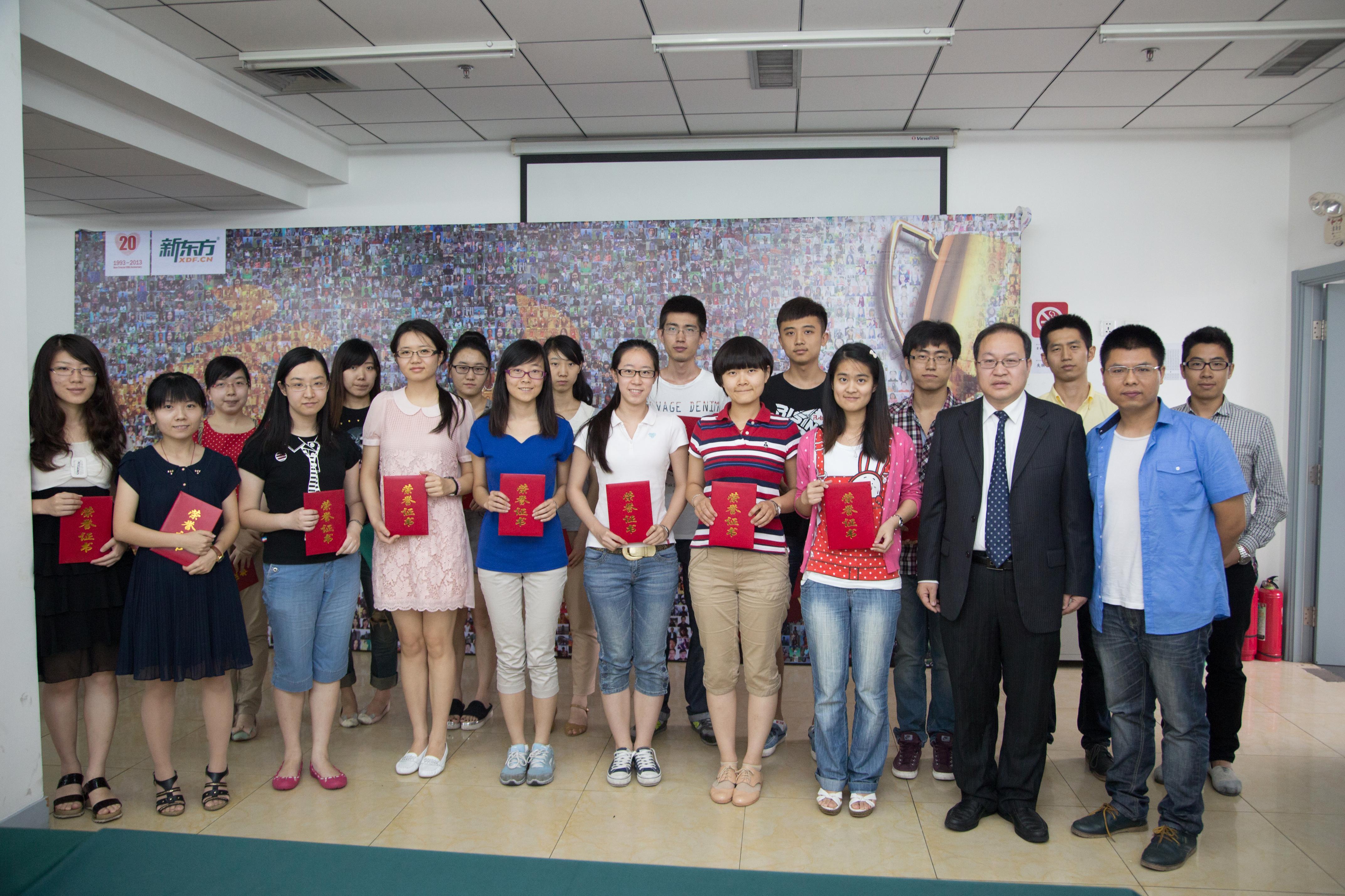 2013年6月22日,新東方北京學校舉辦“綻放榜樣的力量” -- 新東方北京學校2013年優秀學員頒獎典禮,為417名高分學員頒發獎學金。出國留學、考研、四六級、高級同傳、翻譯等二十多個項目領域的“學霸牛人”,齊聚一堂共同分享自己的學習經驗與奮斗成果。新東方教育科技集團副總裁兼新東方北京學校校長汪海濤,攜眾多名師親臨現場,鄭重為獲獎學員頒發代表著巨大榮譽的“新東方獎學金”。