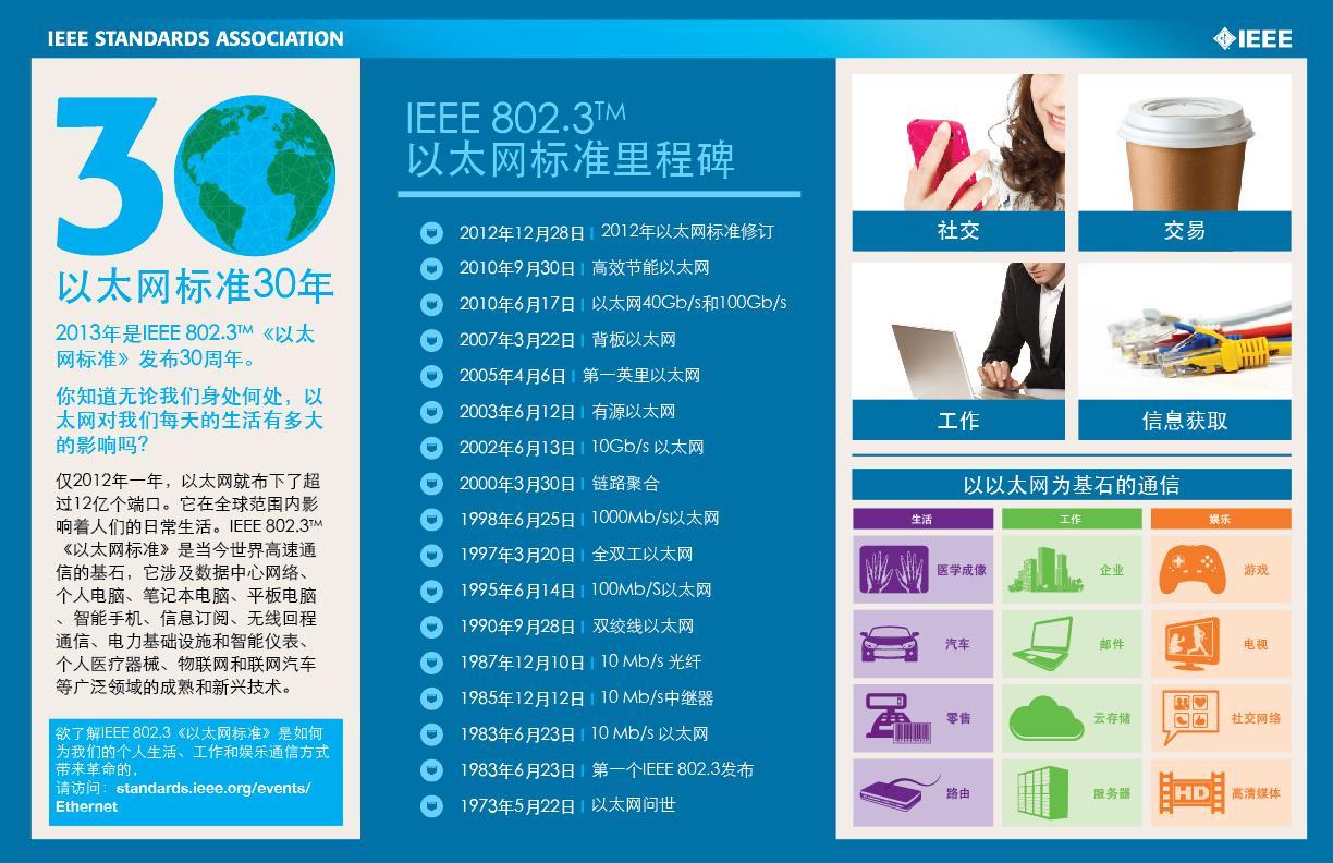美國(guó)皮斯卡塔韋2013年6月27日電 /美通社/ -- 今日,致力于技術(shù)發(fā)展和造福人類的世界較大專業(yè)技術(shù)協(xié)會(huì)IEEE紀(jì)念I(lǐng)EEE 802.3?《以太網(wǎng)標(biāo)準(zhǔn)》發(fā)布30周年。IEEE 802.3是當(dāng)今世界高速通信的基石,它于1983年6月23日獲得首次通過(guò),之后持續(xù)發(fā)布最新的功能和特點(diǎn)以滿足日新月異的市場(chǎng)需求。
