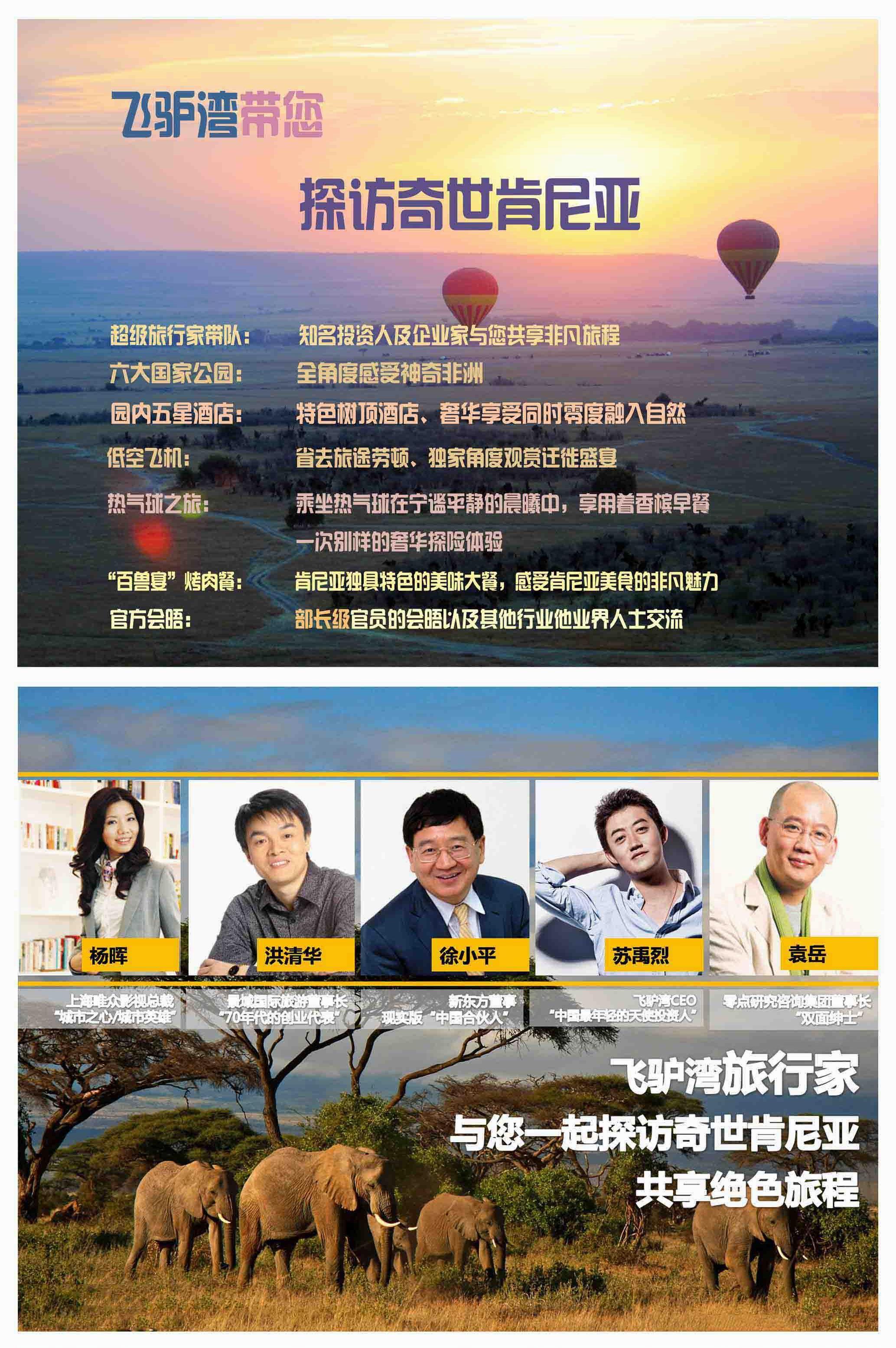值得一提的是,“飛驢灣”行程的特色除了感受旅途中別樣的風(fēng)景以外,核心的部分是人文元素,引入名人帶隊(duì)機(jī)制,讓游客近距離接觸各行業(yè)領(lǐng)袖,拓展人與人之間的交流。具體到肯尼亞的行程,則是特邀徐小平帶隊(duì),團(tuán)隊(duì)成員可以在旅途中與他交流創(chuàng)業(yè)心得、投資之道,而在肯尼亞當(dāng)?shù)剡€將安排一次官方會(huì)晤,團(tuán)隊(duì)成員將有機(jī)會(huì)參與部長(zhǎng)級(jí)的會(huì)晤以及各行業(yè)業(yè)界人士的交流。