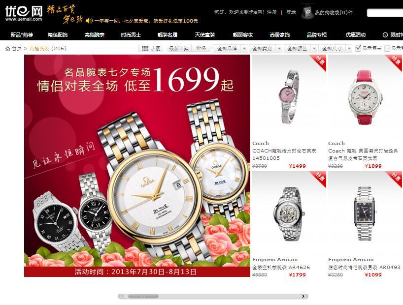 上海2013年8月1日電 /美通社/ -- 中國的情人節即將到來,為了讓所有情侶在七夕節有一個難忘的回憶,優e網精選出百余款新品讓利回饋新老朋友。參加此次促銷活動的品牌涉獵品類有對表、包包配飾、家居、美妝等。本季較大亮點莫過于大牌情侶表的火熱上線,有Emporio Armani、浪琴、Tissot、歐米茄等,其中Emporio Armani情侶對表的促銷價格僅有1699元,更多情侶表也以優惠的價格呈現,大氣簡約的風格和特質亦是辦公白領和情侶所鐘愛的。送一款禮重情也重的定情信物,定能讓TA時刻感受到你的愛意。