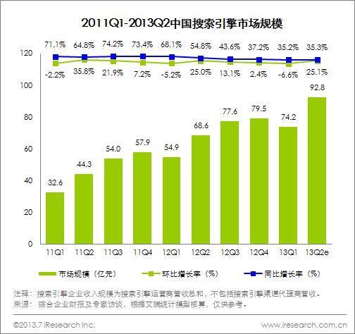 2013Q2中國搜索引擎市場規(guī)模92.8億,環(huán)比回升