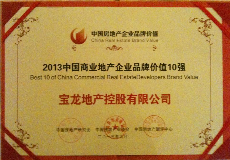 上海2013年9月18日電 /美通社/ -- 2013年9月17日下午,由中國房地產研究會、中國房地產業協會、中國房地產測評中心聯合主辦的“2013中國房地產品牌價值測評成果發布會暨房地產品牌發展高峰論壇”在北京舉行。寶龍地產(HK.1238)獲得2013中國房地產開發企業品牌價值50強(第36名)、中國商業地產企業品牌價值10強(第2名)和中國房地產企業較佳雇主品牌30強(第26名)三項大獎。測評結果顯示,寶龍地產的品牌價值達46.84億,較去年增長5.26億元。