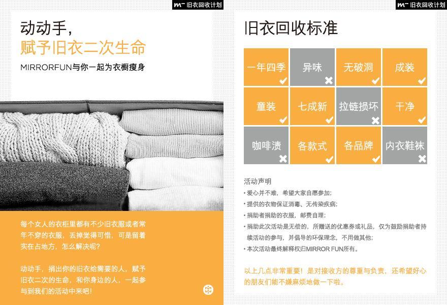 2、有始有終獎:自己收集舊衣參與活動+@三位好友+ mirrorfun官方微博+拍捐助舊衣的照片(鼓勵大家全程直播自己捐衣過程),將贈送mirrorfun獨家研發的專屬禮品一份。