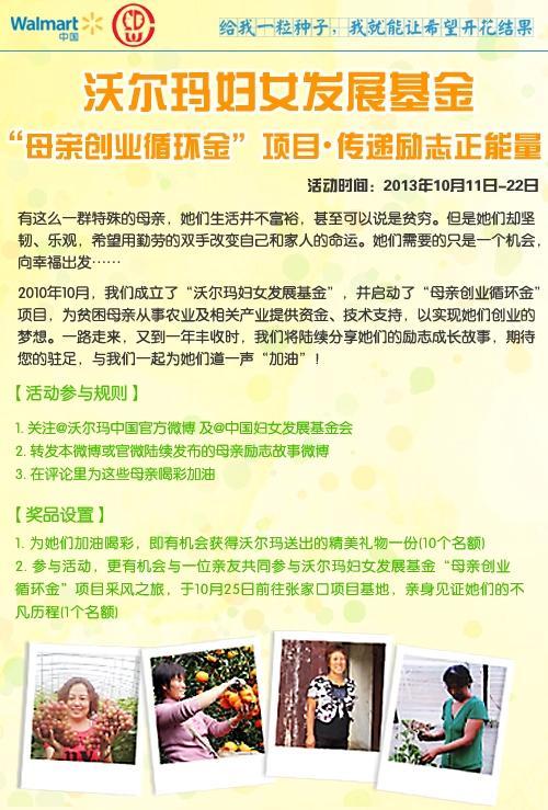 深圳2013年10月14日電 /美通社/ -- 近日,沃爾瑪中國在官方微博(@沃爾瑪中國官方微博,http://weibo.com/wmcsr)上線“為創(chuàng)業(yè)母親喝彩,傳播勵志正能量”慈善主題活動,講述在沃爾瑪“母親創(chuàng)業(yè)循環(huán)金”項目幫助下,貧困母親的勵志創(chuàng)業(yè)故事;并號召網(wǎng)友參與互動,為這些通過辛勞改變自己和家人命運的母親們喝彩。網(wǎng)友參與微博活動,即有機會贏取精美禮物,還有可能被選中參與沃爾瑪“母親創(chuàng)業(yè)循環(huán)金”項目采風之旅,前往張家口項目基地,見證創(chuàng)業(yè)母親的成長歷程。