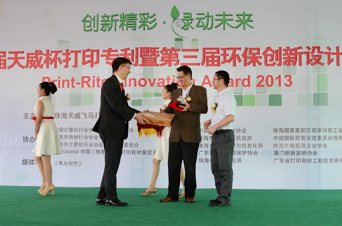 珠海2013年10月21日電 /美通社/ -- 10月17日,以“尊重知識(shí)產(chǎn)權(quán),推動(dòng)自主創(chuàng)新,共贏綠色經(jīng)濟(jì)”為宗旨的2013年第七屆“天威杯”打印專利暨第三屆環(huán)保創(chuàng)新設(shè)計(jì)大賽頒獎(jiǎng)典禮在中國(guó)國(guó)際打印耗材展覽會(huì)現(xiàn)場(chǎng)隆重舉行。5件打印專利作品分獲各類“專利獎(jiǎng)”,6個(gè)對(duì)推動(dòng)通用耗材發(fā)展具有卓越貢獻(xiàn)的政府機(jī)構(gòu)、企事業(yè)單位榮膺各類“美麗中國(guó)-綠色行動(dòng)公益獎(jiǎng)”。
